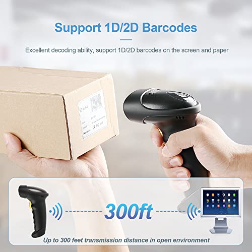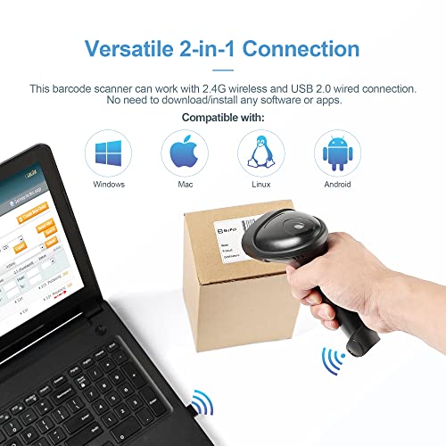 [2-in-1 Connection Mode] This barcode scanner can work with 2.4G wireless and USB 2.0 wired connection. No need to download/install any software or apps. It supports Windows 7/8/10/11, Linux, Mac, Android; works with Word, Excel, Novell and almost all common software.